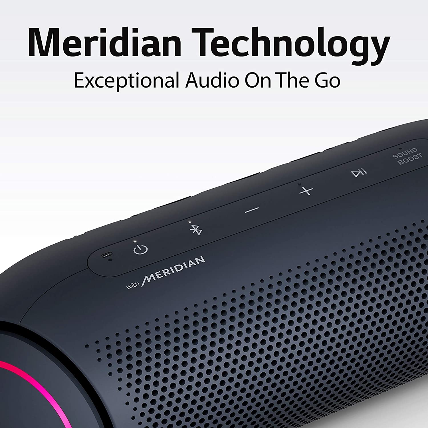 - A The small, sleek body of the LG XBOOM Go packs a big punch with 20 watts of power and stereophonic sound. With Meridian audio technology and dual passive radiators, you get one powerful speaker that couldn't be easier to pack with you. ^Daphane
