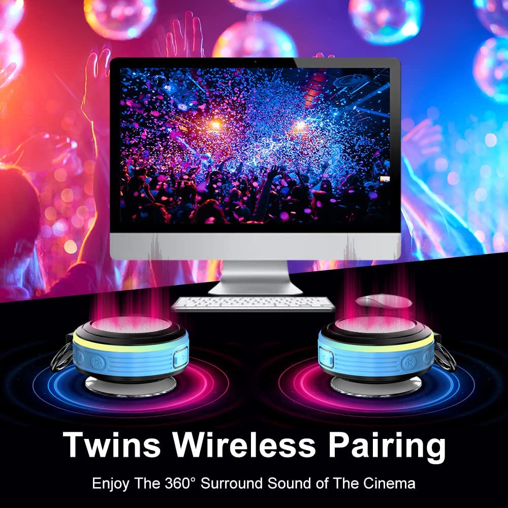Bluetooth Shower Speaker, IPX7 Waterproof Portable Speaker with LED Light, Suction Cup, Hook, Stereo Sound, True Wireless Stereo Mini Speaker with Built-in Mic, FM Radio, for Bathroom, Pool, Outdoors